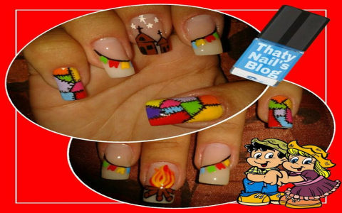 Comprei 50 unhas por R$35,00 – unhas quadradas simples pra decorar. Levei tintas que já tinha em casa e passei a noite pintando bandeirolas e estrelinhas. Ficou show!